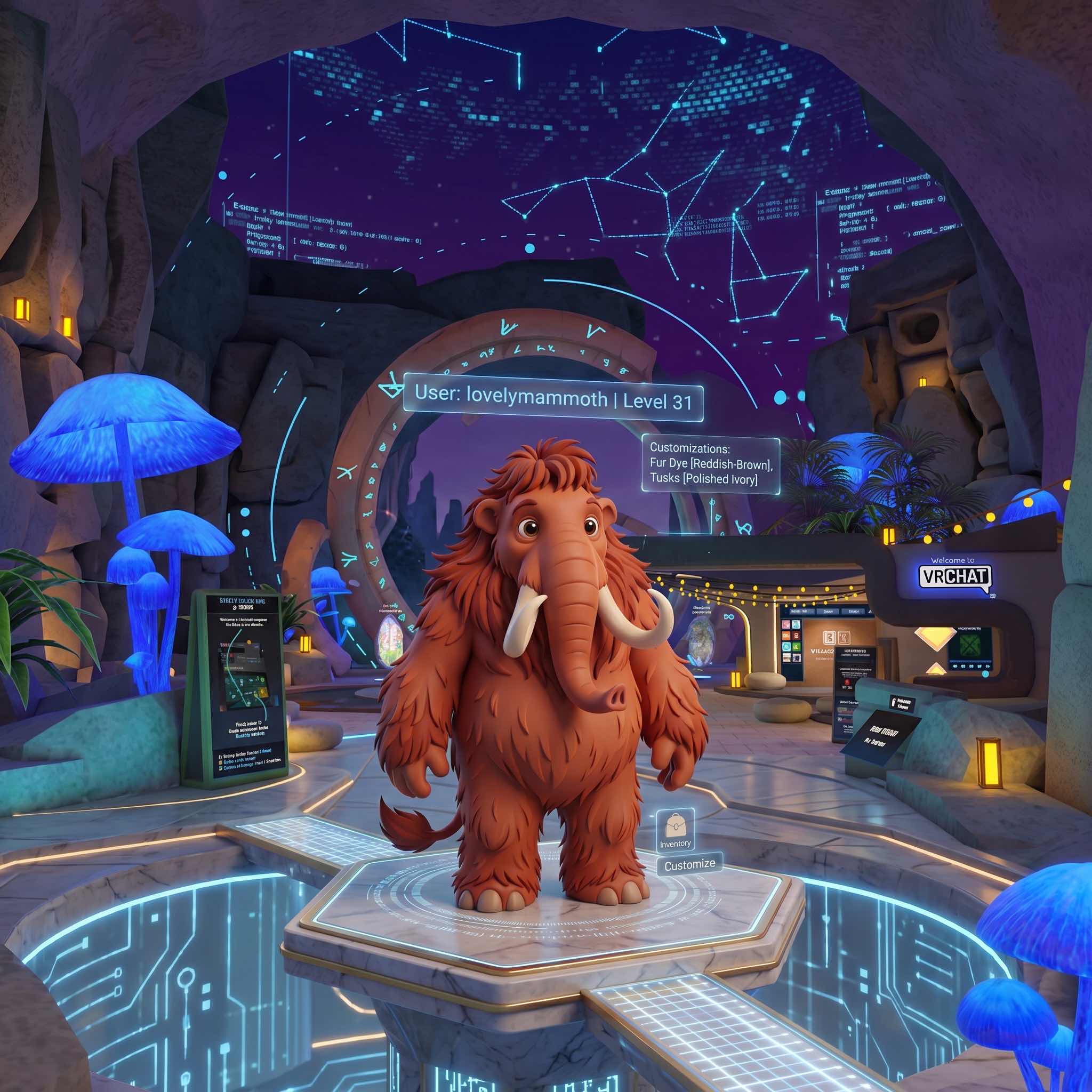 Image: The custom Lovely Mammoth avatar in VRChat home world (AI generated)